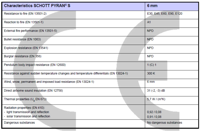 Amongst the entire range of SCHOTT fire resistant products, PYRAN® S offers the greatest multi-functionality. PYRAN® S is a monolithic thermally tempered borosilicate safety glass according to DIN EN Standard 13024-1.